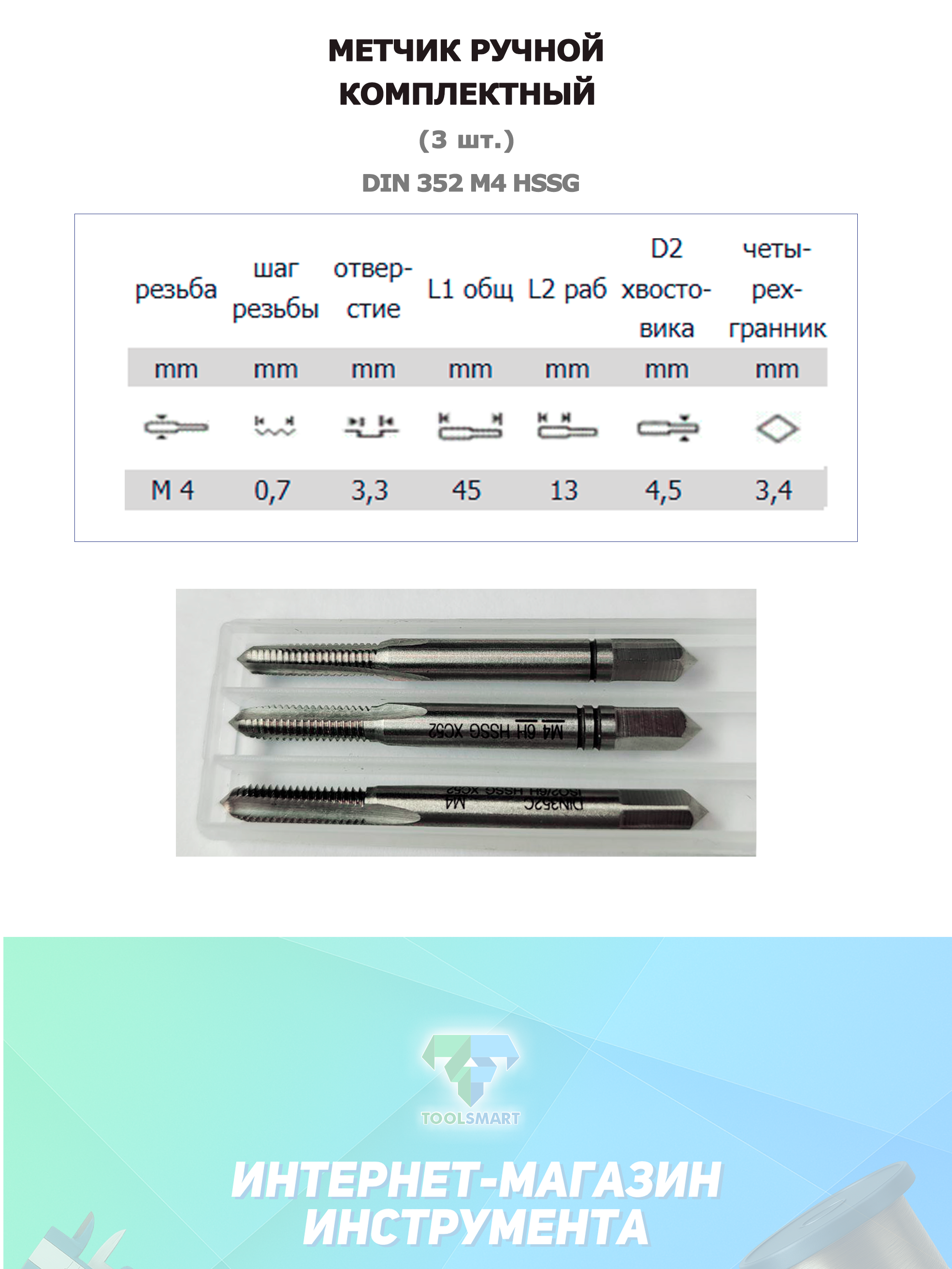 —Ручной метчик набор из 3 шт DIN 352 HSS M4